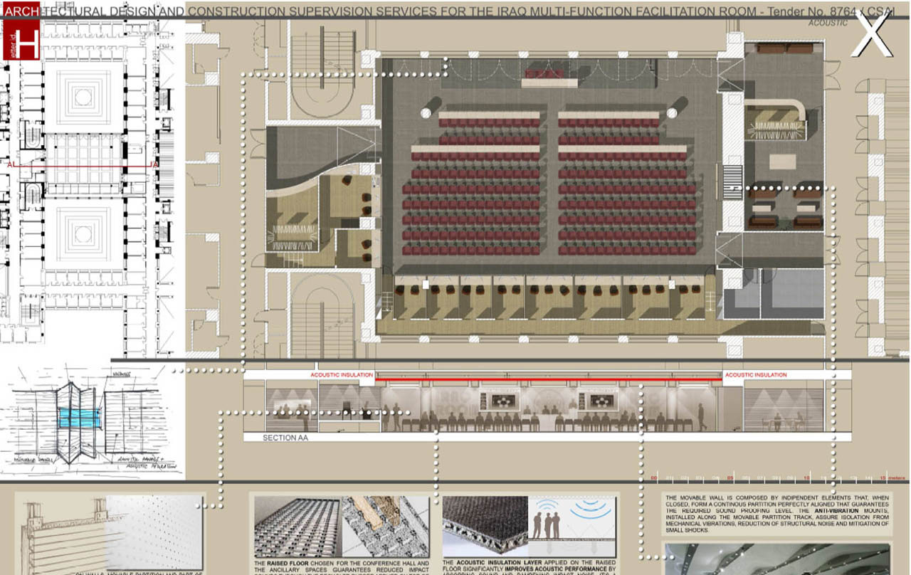 Progetto dell'Isolamento e dell'Assorbimento Acustico della nuova Sala Polifunzionale della sede FAO in Roma, eseguito per conto ed in collaborazione con la società Integra AES s.r.l. di Roma. Gara n. 8764/CSAI